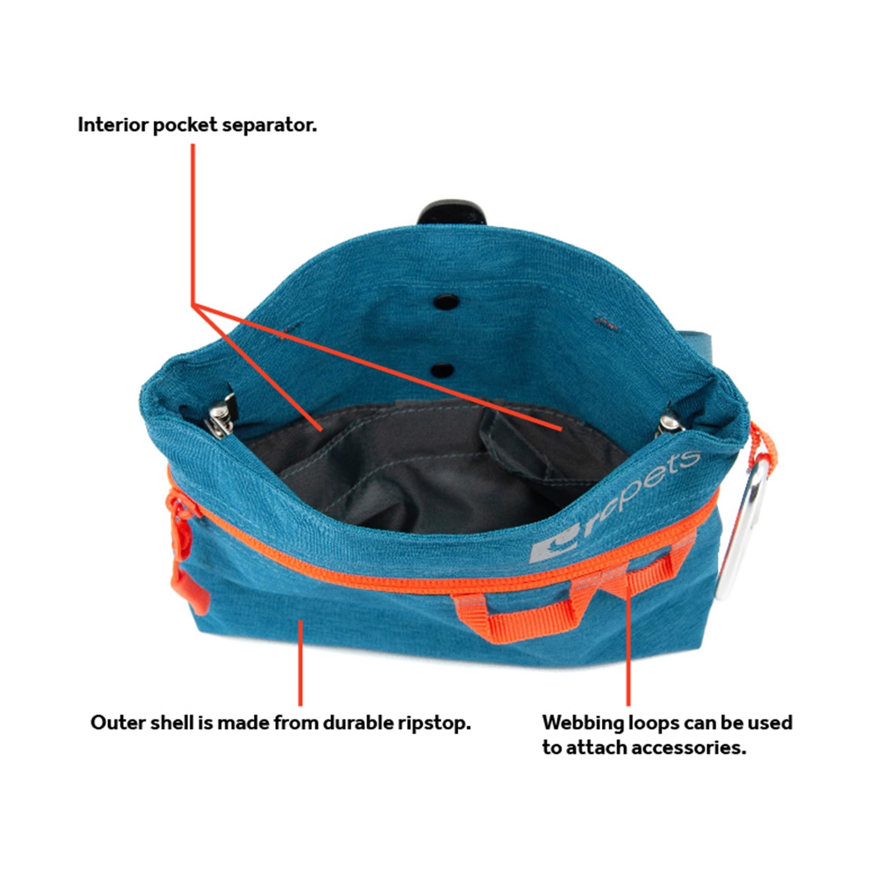 • Interior pocket separator means you can carry two types of treats or separate your personal items