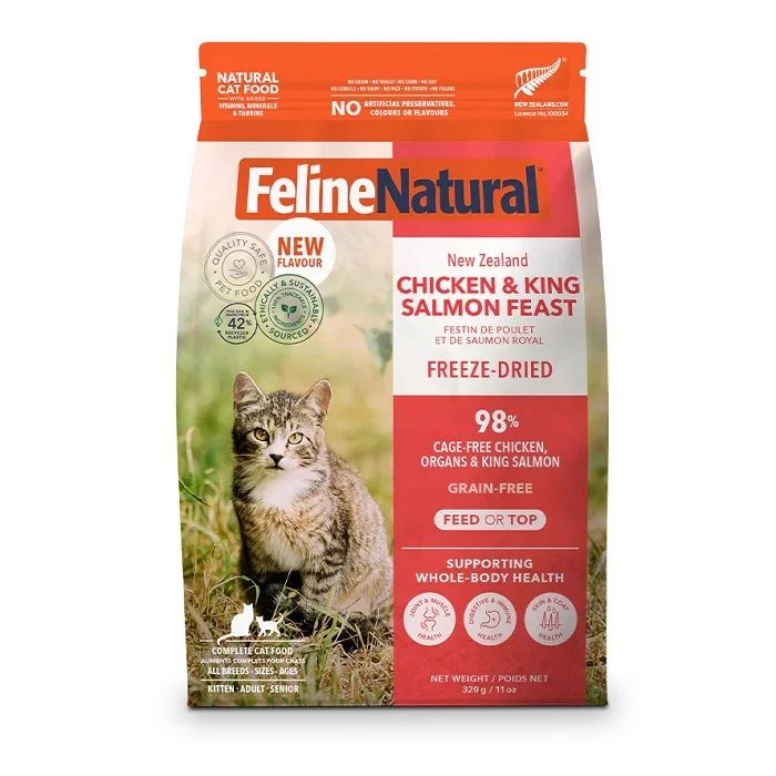 Ingredients in Feline Natural Chicken & King Salmon Freeze Dried: Chicken, Chicken Liver, New Zealand King Salmon, New Zealand Green Mussel, Vitamin E Supplement, Hoki Oil, Dried Kelp, Taurine, Flaxseed Flakes, Choline Chloride, Dipotassium Phosphate, Salt, Minerals (Magnesium Oxide, Zinc Proteinate, Copper Proteinate, Manganese Proteinate), Vitamins (Thiamine Mononitrate, Pyridoxine Hydrochloride, Folic Acid, Vitamin D3 Supplement).