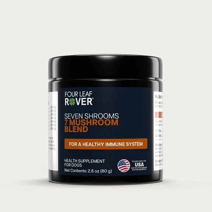 Four Leaf Rover Seven 'Shrooms Ingredients: Organic turkey tail mushroom extract, organic chaga mushroom extract, organic cordyceps mushroom extract, organic phellinus mushroom extract, organic maitake mushroom extract, organic reishi mushroom extract, organic shiitake mushroom extract.