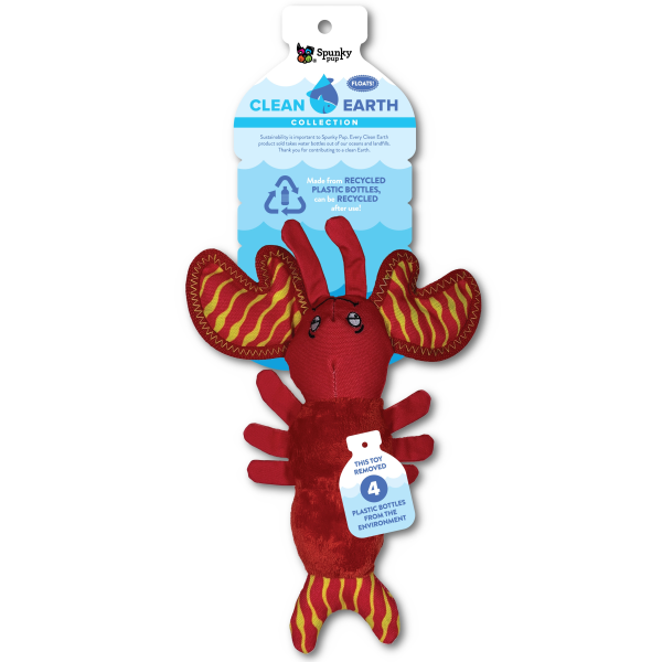 Features of the Spunky Pup Clean Earth Lobster Recycled Plush Dog Toy: